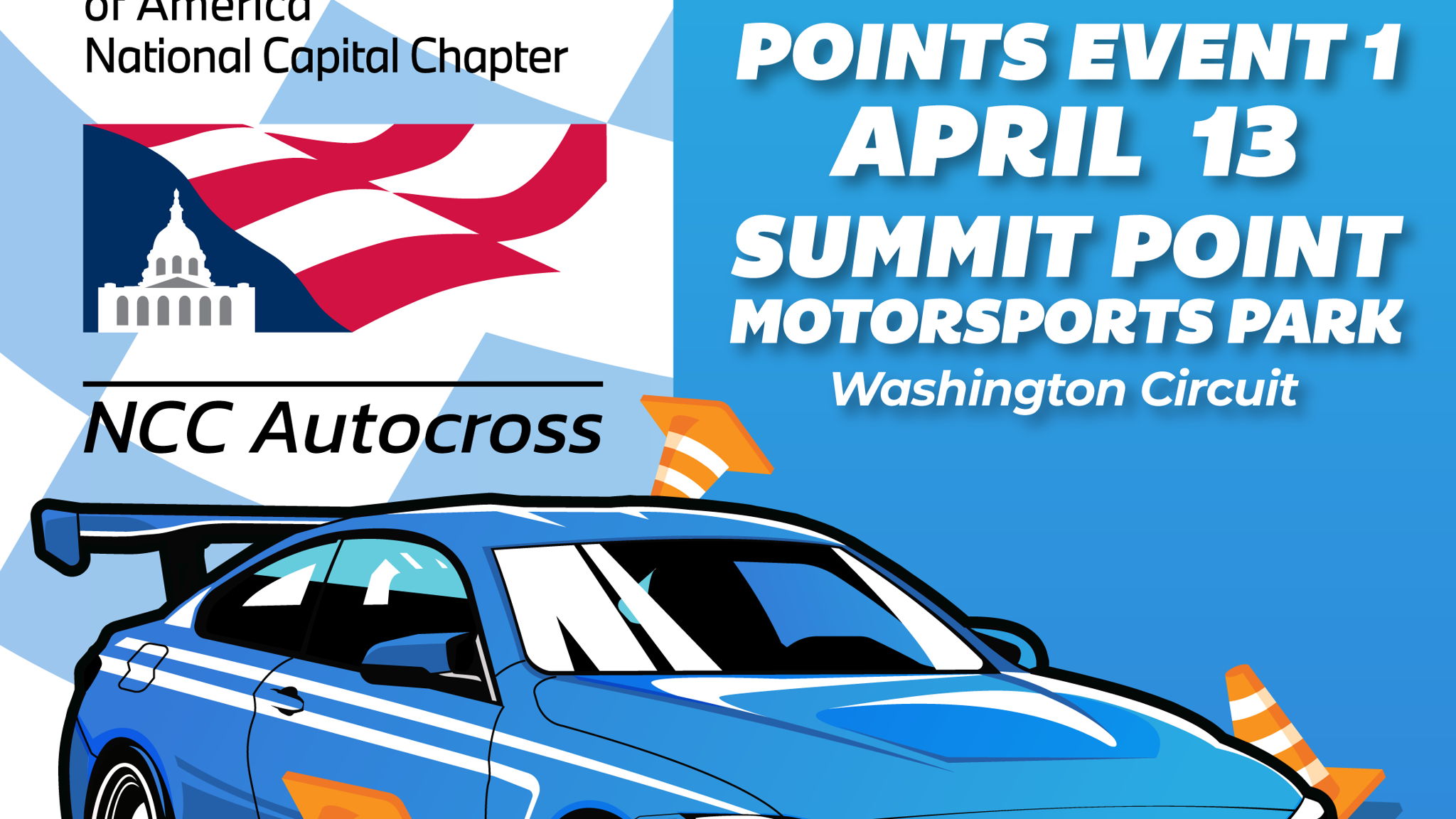 Autocross is a safe, low-speed motorsport where competitors drive against the clock to turn in the best times as they navigate a driving course defined by orange parking cones in a large, open lot. Our NCC Autocross Points events are a great way for new and experienced autocross participants to learn more about autocross and improve their driving performance. Come join us for a fun and educational day filled with safe but adrenaline raising motorsport.